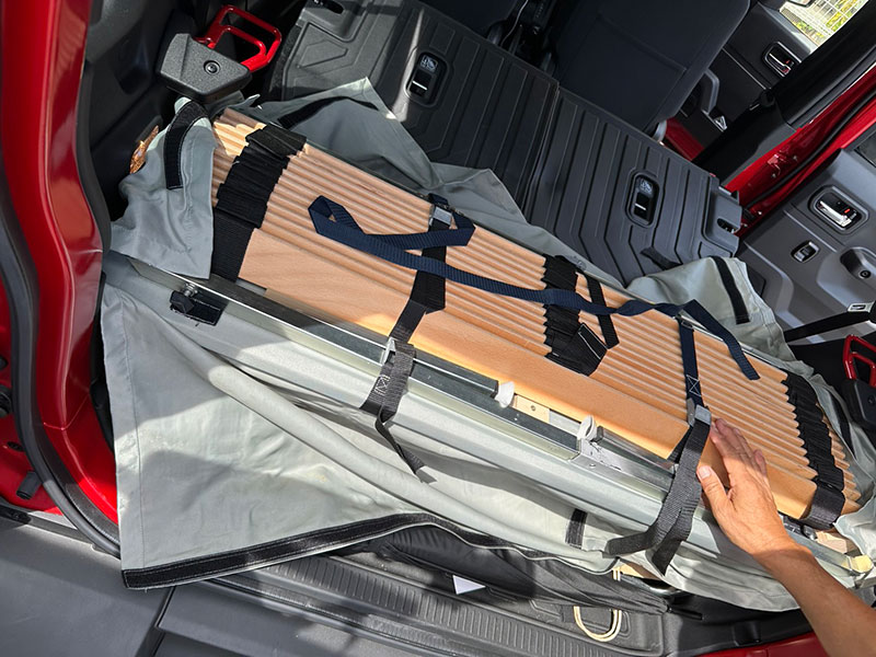 リアが狭い車両でも問題なく積み込みでき、展開すればしっかり休めるスペースが確保できるのは大きな魅力です。