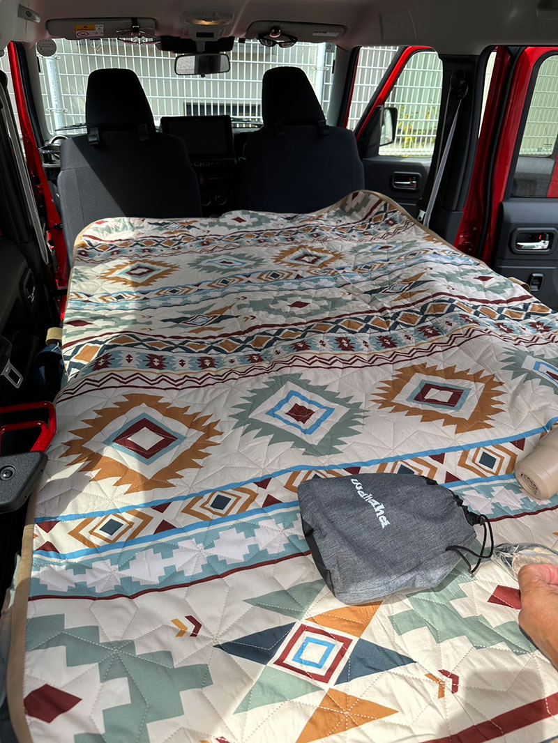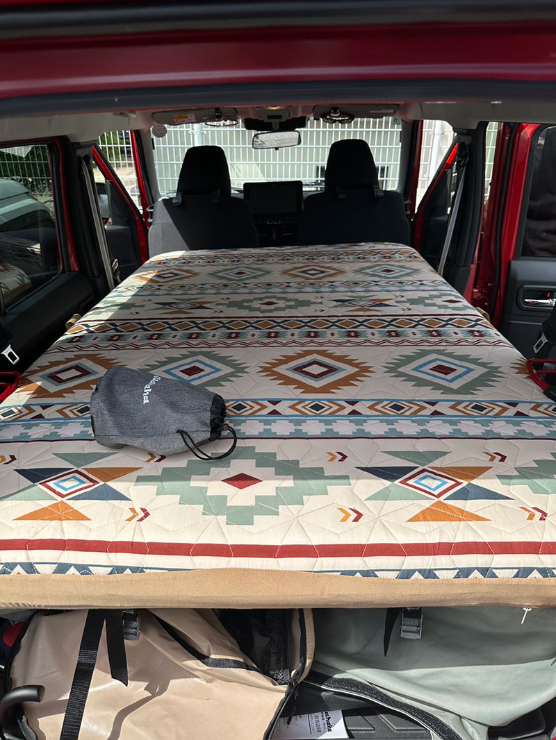 展開すれば一瞬でフルフラットのベッドが完成し、まるで車の中に“移動式の寝室”を作ったような感覚になります。